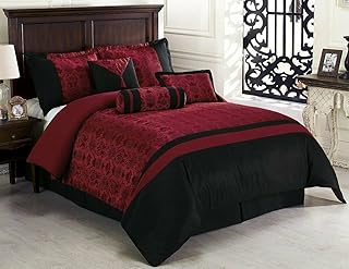Chezmoi Collection Napa 豪華な葉っぱスクロール刺繍寝具掛け布団7点セット (フル、レッド/グレー/ブラック)