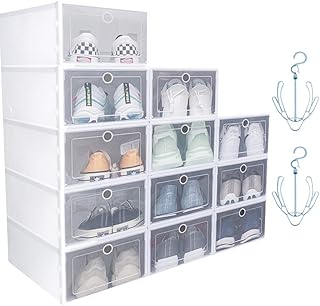 Hptmus プラスチックシューズストレージオーガナイザー - 12個 シューズストレージボックス クリアシューズボックス 蓋付き 積み重ね可能 プラスチック シューズオーガナイザー 前開き