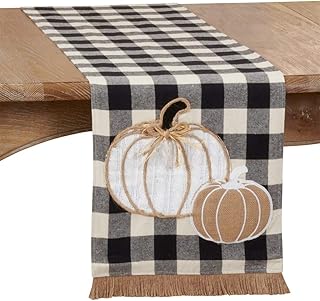 Fennco Styles バッファロー格子柄 ハーベスト パンプキン フリンジ テーブルランナー 幅14インチ x 長さ72インチ - ブラック&ホワイト 伝統的なテーブルカバー 家庭 宴会 感謝祭 クリスマス 家族の集まり 特別なイベント用