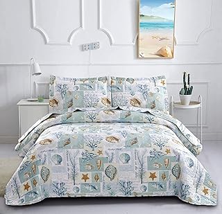 Ycosy 3ピース オーシャンキルト寝具 パープルブルー 海の世界 ビーチコンク カートゥーンベッドスプレッド 子供用 フル/クイーンサイズ ソファ/カウチカバー リバーシブルベッドカバー 枕カバー2枚付き