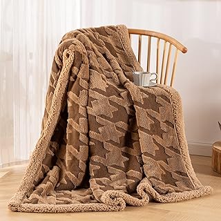 HT&PJ 格子縞シェルパフリーススローブランケット 千鳥格子 ファジー ソフト 暖か 厚手 オールシーズン用 カウチ ベッド ソファ(カーキ、スロー(50インチX60インチ)