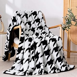 HT&PJ 格子縞シェルパフリーススローブランケット 千鳥格子 ファジー ソフト 暖か 厚手 オールシーズン用 カウチ ベッド ソファー ブラック ホワイト スロー(50インチX60インチ)