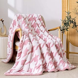 HT&PJ 格子縞シェルパフリーススローブランケット 千鳥格子 ファジー ソフト 暖か 厚手 オールシーズン用 カウチ ベッド ソファ(ピンクホワイト、スロー(50インチX60インチ)