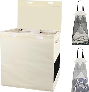HOUSE AGAIN ダブル洗濯かご 蓋と取り外し可能なランドリーバッグ - 2セクション ボディ全体から取り外して洗濯可能なかご 簡単に持ち運び 大きな洗濯かご 防臭 防湿 (ベージュ)